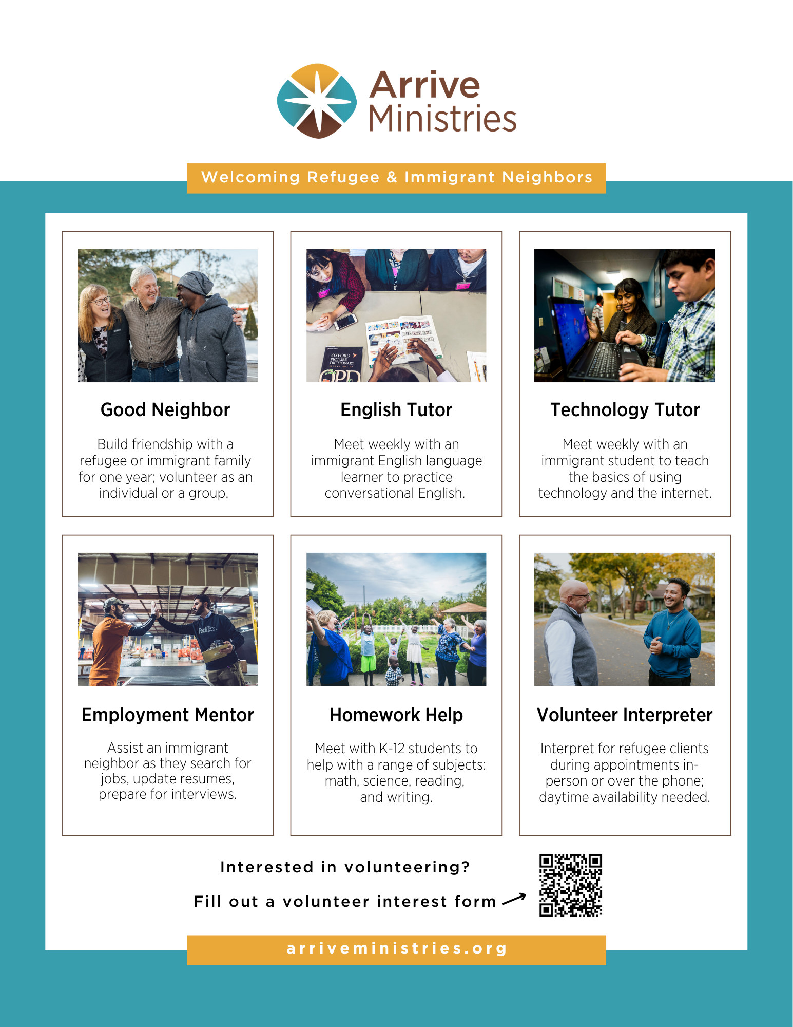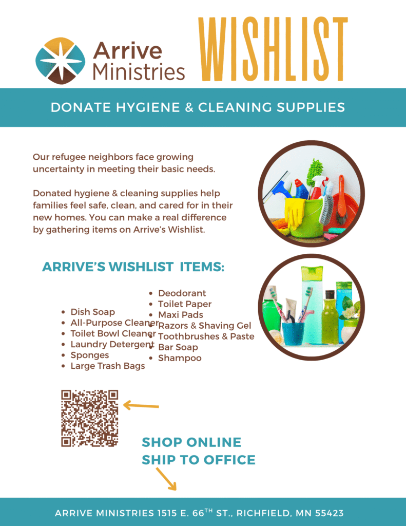 Arrive Ministries is a refugee resettlement agency providing essential services and practical assistance to refugees and immigrants to advance self-sufficiency. We mobilize volunteers, in partnership with local churches, to extend love and friendship to our new neighbors to promote thriving in a new homeland.